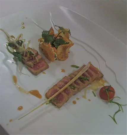 Подготовить кусок тунца, обжарить слегка с 4 сторон на оливковом масле. После чего выложить в маринад из оливкового масла, арахисового масла, соевого соуса и кориандра. Приготовить майонез, и добавить в него табаско. Приготовить вафельные чипсы из картофеля – нарезать картофель, оставить на 1 час в холодной воде, потом обжарить во фритюре или на масле. Приготовить брюнуаз (мелкая нарезка кубиками) из цукини, моркови и сельдерея. Обжарить на сковороде (если есть – вок) на кунжутном масле с кориандром соевые ростки.