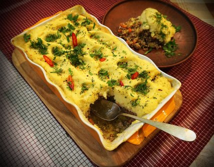 Лук и чеснок очистить от кожуры, промыть и измельчить.Обжарить лук с чесноком на растительном масле до золотистого цвета.Добавить фарш и продолжить обжаривать, постоянно помешивая. Затем добавить грибы, мелко нарезанную спаржу. Добавить мясной бульон и специи.Готовить еще несколько минут. Выложить мясную смесь на дно жаропрочной формы. Если подготовленное заранее пюре слишком густое, разбавить его немного молоком.Добавить в пюре 1 яйцо и взбить пюре венчиком. Равномерно выложить пюре поверх мясной смеси.При помощи смоченной в холодной воде столовой ложки придать пюре волнистую форму. Запекать в духовке при 225 о С 20-30 минут.В XIX веке в обеде из двух кушаний обыкновенно первым подавали суп, а вторым — жаркое, если же обед состоял из многих блюд, то жарким называли последнее подаваемое жареное, которым обыкновенно бывала живность или дичь, и к нему обыкновенно подавали ещё и салат.