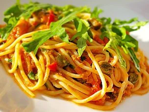 Спагетти отварить. Помидоры вымыть и мелко нарезать, вырезав у них семена. Рукколу крупно порубить. Тунца слить и разделить вилкой на кусочки. Разогреть в сковороде оливковое масло и пассеровать в нем чеснок, пропущенный через пресс. Из перца чили удалить семена и перегородки и мелко нарезать. Выложить его в сковороду вместе с томатной пастой и обжарить. Добавить помидоры, влить вино, бульон и на сильном огне уварить. Добавить каперсы и тунец, посолить, прогреть и снять с огня. Добавить рукколу и перемешать. Спагетти выложить в сковороду с соусом и перемешать.