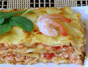 Запекайте лазанью на среднем огне чуть меньше часа. Украсьте креветками и мидиями. Приятного аппетита!