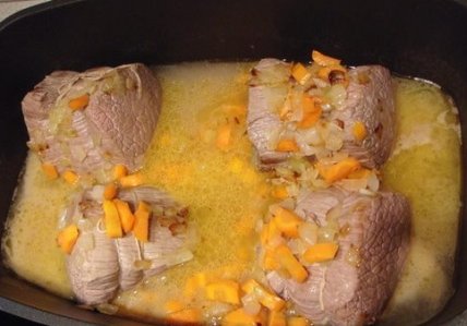 Добавьте соль и перец, прованские травы по вкусу. Переложите мясо в кастрюлю с толстым дном, залейте вином и бульоном.
