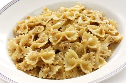 - Отварите фарфале согласно инструкции на упаковке до состояния al dente. Слейте из макарон воду и добавьте лук, перемешайте. Добавьте гречку и перемешайте и прогрейте.