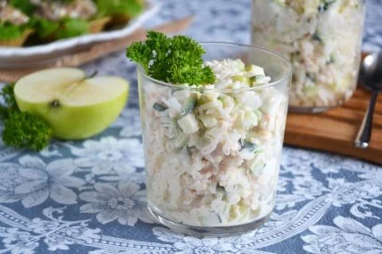 - Заправить такую закуску можно майонезом. Перед подачей салат рекомендуется охладить – так будет еще вкуснее.