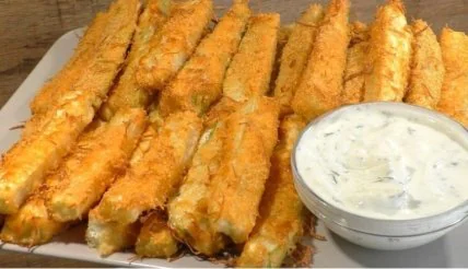 - Каждый брусочек кабачка обваляйте в чесночно-сметанном соусе, а затем – в сырной смеси. Излишки встряхните и выложите на предварительно покрытый пергаментом противень.