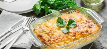 - Отправьте запеканку в духовку на 40 минут или до готовности картофеля.