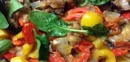 3. Выложите баклажаны в форму для запекания. Сверху вылейте на них овощную смесь и потомите в духовке в течение 10–15 минут. По желанию можно украсить свежей зеленью.