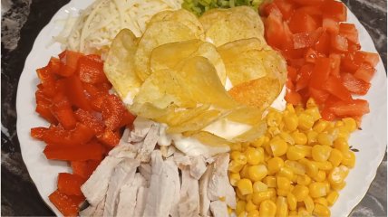 Майонез выкладываем в центр тарелки. Сверху украшаем чипсами. Перед тем как подавать салат гостям на тарелки, осторожно перемешиваем его.
