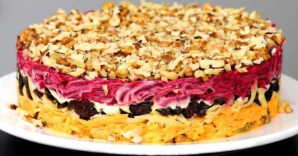 Отварную свеклу также натираем на терке, добавляем в нее измельченные орехи и майонез. Выкладываем на тарелку третьим слоем.