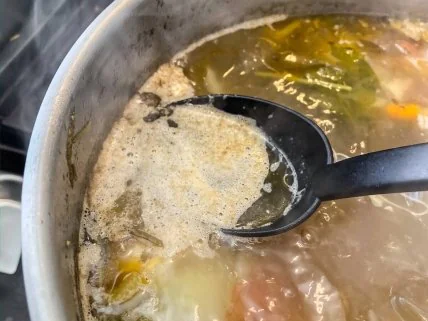 Бульйон стає мутним від домішок. Чим менше домішок, тим прозорішим буде бульйон. Накип на бульйоні — це тваринні білки, які при високій температурі згортаються, утворюючи на поверхні бульйону сіро-коричневу піну. Він не впливає ні на смак, ні на харчову цінність супу, але псує його вигляд.