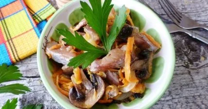 - Готові овочі з грибами перекладаємо салатник і відправляємо на півгодини в холодильник.