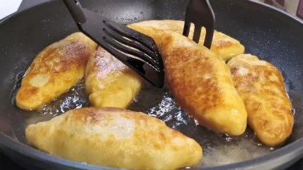 - З кожного шматочка тіста формуємо коржик, у центр викладаємо начинку та защипуємо. Пиріжки смажимо на середньому вогні до золотистого кольору по 3-4 хвилини з кожного боку і викладаємо на паперові рушники, щоб увібрався зайвий жир.