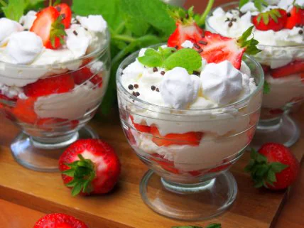- У прозорі склянки, креманки або вазочки викладіть першим шаром шматочки охололого безе. Далі йде шар полуниці. Потім — вершки. Просто чергуйте шари, поки не заповните склянки доверху.