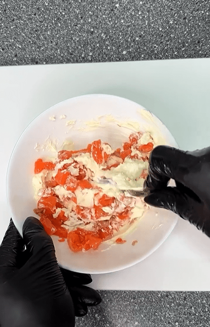 2.Червону рибу нарізати на невеликі шматочки, з'єднати її з сиром, перемішати виделкою.