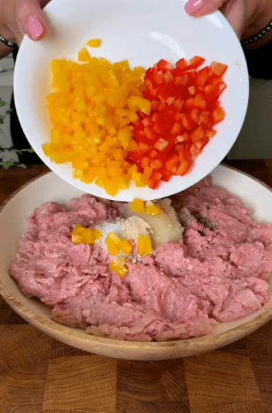1.До фаршу додати натерту або перекручену цибулю, сіль, перець, сушений часник та нарізаний кубиком перець.