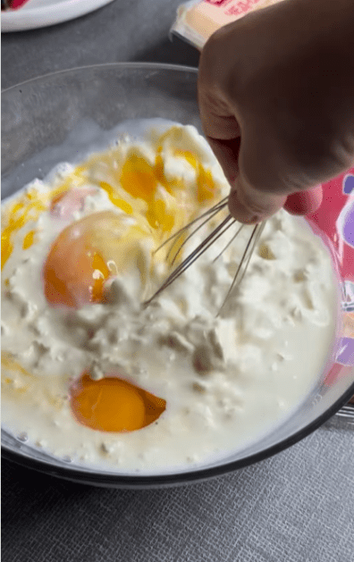 1.У посуд викласти кисломолочний сир, яйця, молоко і натерти моцарелу.
