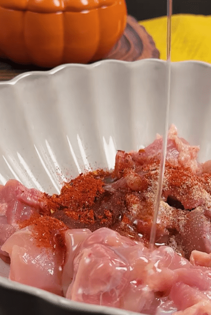 1.Куряче стегно без шкіри та кістки нарізати на кубики. Замаринувати в спеціях та полити олією.