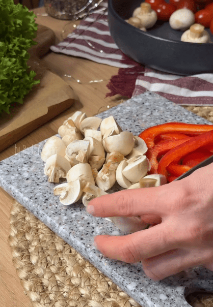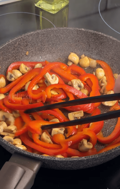 3.Солодкий перець нарізати смужками, також нарізати гриби.