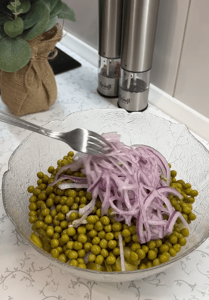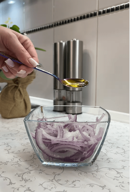 1.Цибулю замаринувати, нарізавши її півкільцями та додавши по чайній ложці солі, цукру, оцту та води. Залишити маринуватися на 30 хвилин.