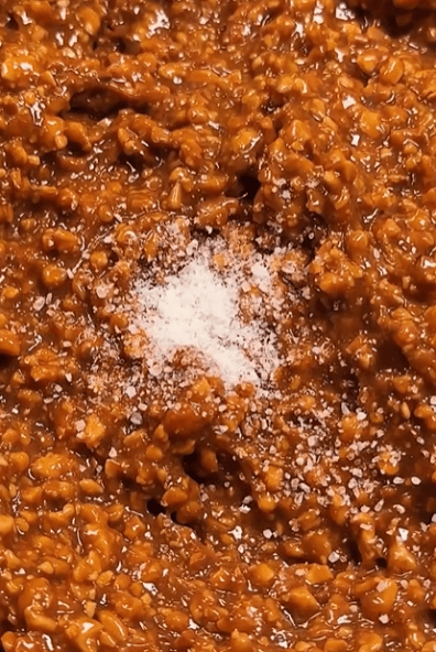 1.Арахіс перебити на крихту і додати до згущеного молока. Зверху посипати дрібкою солі для балансу смаку.