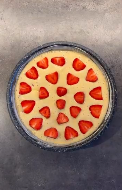 4.Змастити форму вершковим маслом, викласти тісто, зверху додати половинки полуниці.