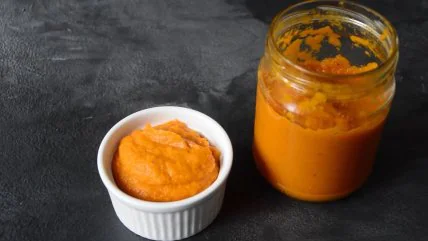 - Перекласти суміш у глибоку миску або чашу блендера, подрібнити до однорідної консистенції.