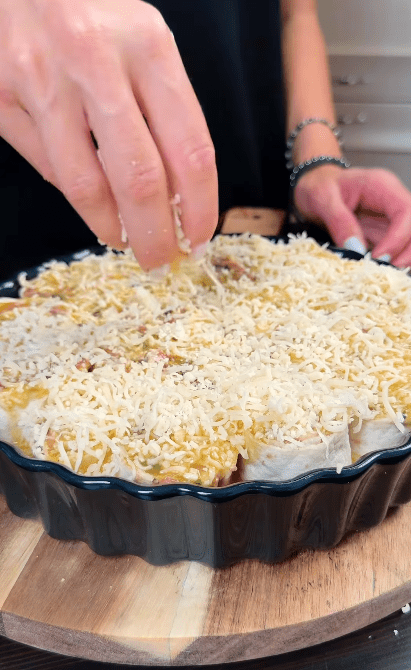 4. Збити яйця та додати натертий сир. Вилити все рівномірно на лаваш. За бажанням можна зверху посипати ще додатково сиром.