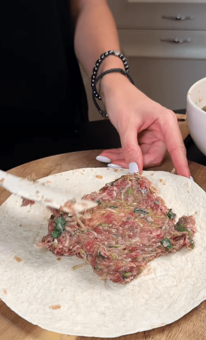 2. Викласти фарш на лаваші. Згорнути та нарізати на рівні шматочки.