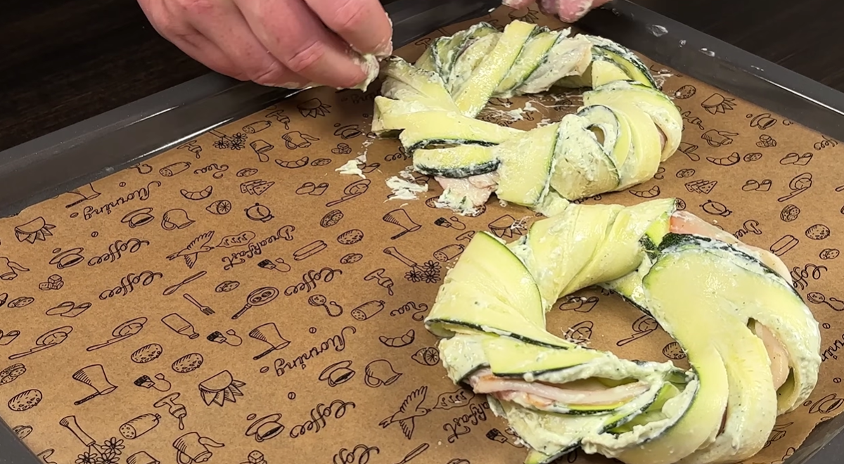7. Сформуйте з кабачків спіраль, а потім викладіть їх у формі кільця на застелене пергаментом деко.