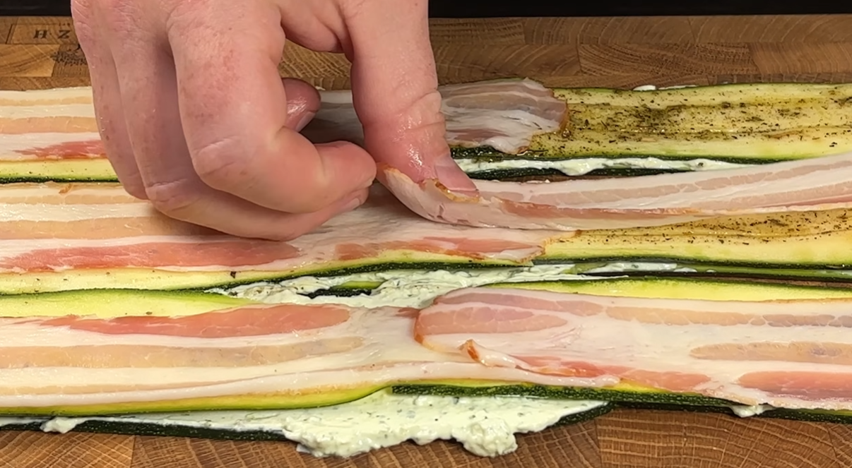 5. Викладіть бекон на кабачки. Зверху покладіть кабачкові слайси, зробіть надрізи.