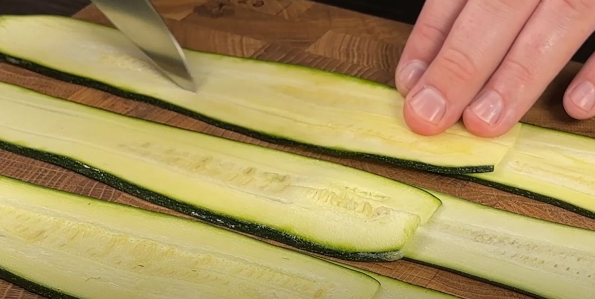 1. Кабачки наріжте вздовж тонкими слайсами. На кожному слайсі зробіть по два надрізи.