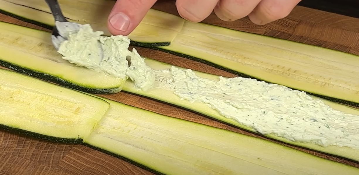 6. Змастіть кабачки сирною сумішшю з часником і накрийте кабачковими слайсами.