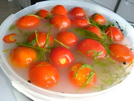 Якщо ви не хочете возитися з банками та стерилізацією, цей рецепт квашених помідорів саме для вас. За цим рецептом вони готуються у звичайному відрі чи каструлі, а куштувати їх можна вже за кілька днів. Завдяки зелені, спеціям та листю хрону помідори виходять ароматними й дуже апетитними — чудова закуска до будь-якої страви.