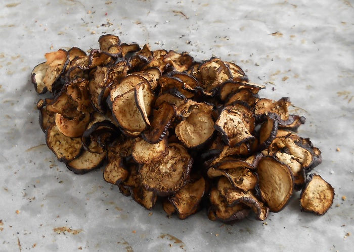 Наріжте баклажани тонкими скибочками, викладіть їх на застелене пергаментом деко і сушіть у духовці при температурі 50–60 °C приблизно 4-6 годин.
