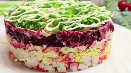 Буряк та крабові палички несподівано вдало поєднуються у цьому святковому салаті