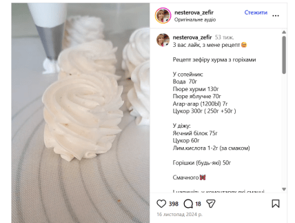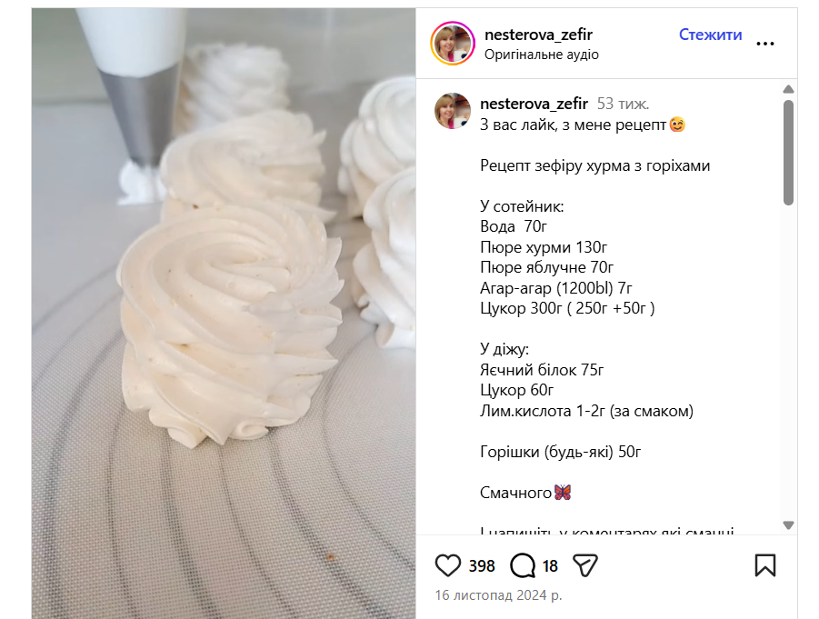 З неї готують десерти, варення, соуси й навіть ароматну настоянку. Але сьогодні ми пропонуємо перетворити хурму на витончений десерт — ніжний домашній зефір із горіхами, який стане справжньою прикрасою столу та здивує поєднанням текстури й смаку. Рецептом з нами поділилися на Instagram-сторінці "nesterova_zefir".