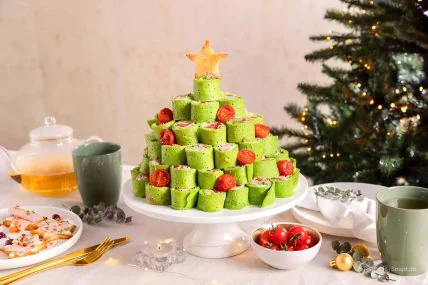 - Нарізати рулети на шматочки завдовжки 4–5 см і викласти у формі ялинки на великій тарілці.