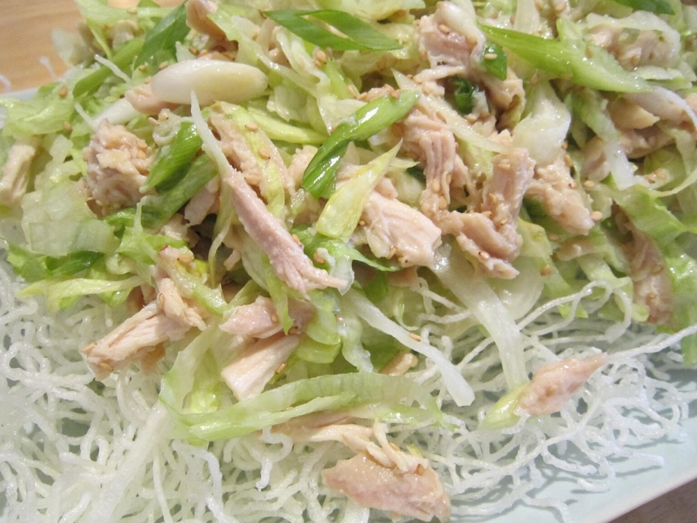 - Відварити курку, нарізати повздовжніми шматочками.