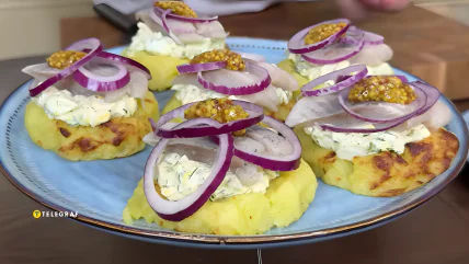 Ця закуска смакує теплою, коли картопля ще зберігає аромат після запікання, але її також можна подавати і в холодному вигляді.