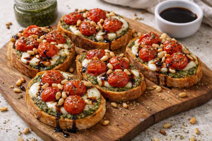 Такі тости ідеально смакують із чашкою чорної кави, зеленого чаю або легкого цитрусового фрешу. Для більш ситного варіанту їх можна подати разом із яйцем пашот, салатом із руколи або додати кілька скибок прошуто. Гарно прикрасити страву свіжим базиліком чи мікрогріном, а для святкової подачі викладати тости на велику дерев’яну дошку.