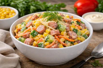 - З’єднати у глибокій мисці огірки, ковбаски, кукурудзу, сир та моркву по-корейськи.