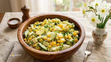 Щойно з’являється перша молода зелена цибуля, на столі обов’язково з’являється цей простий, але улюблений салат. Завдяки поєднанню яєць, огірка та кукурудзи, страва виходить легка й водночас поживна. Цей салат готується буквально за лічені хвилини. Особливо доречно він смакує навесні — як самостійна закуска, доповнення до великоднього меню або свіжий гарнір до запеченого м’яса й картоплі.