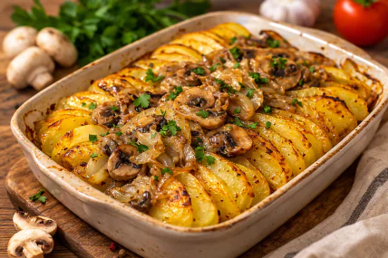 Для максимальної ароматики бажано обирати гриби з щільною структурою, наприклад печериці або гливи. Картопля не повинна бути занадто борошниста – інакше скибочки можуть розвалюватися при запіканні. Використання олії з нейтральним смаком або легкого пісного майонезу допоможе рівномірно розподілити спеції та підкреслити смак грибів. Паприка та прованські трави додають страві глибини та легку пікантність, а спеції можна коригувати на власний смак.