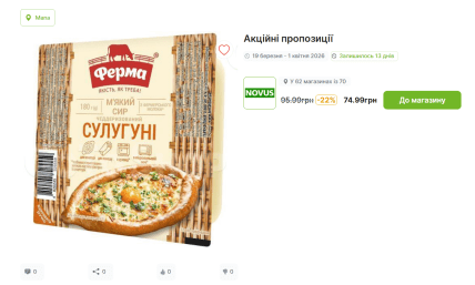 Сир сулугуні — це м’який напівтвердий сир грузинського походження, який додають у безліч страв: від класичних піц і запіканок до закусок, наприклад салату з сулугуні та моркви по-корейськи. Сьогодні ж ми пропонуємо швидкий та простий рецепт лінивого хачапурі, який можна приготувати всього за 10 хвилин. Зараз у мережі Новус сир сулугуні ТМ "Ферма", 180 г, коштує 95,99 грн, а за акцією — лише 74,99 грн (-22%), і це чудова можливість заощадити та нагодувати всю родину. Обираючи сир, важливо звертати увагу на його свіжість, однорідну консистенцію і приємний запах, адже від цього залежить смак готового хачапурі.