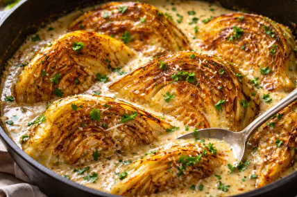 Капуста – універсальний овоч, який часто використовують у традиційній кухні, а найпопулярнішою стравою з неї є борщ. Сьогодні пропонується інший варіант – запечена капуста у вершковому соусі з ароматними спеціями, яка стає самостійною стравою або чудовим гарніром. Для найкращого результату обирати щільні, соковиті головки без пошкоджених листків, а олію та вершки брати свіжі та без сторонніх запахів. Типові помилки – пересмаження капусти або недостатнє загущення соусу; щоб уникнути цього, важливо контролювати час обсмажування і густину соусу. В рецепті можливі варіації – додати часник, трохи чилі, або замінити пармезан на інший твердий сир, а бульйон – на овочевий чи курячий для різних смакових відтінків. Рецептом з нами поділилися на Instagram-сторінці "olga_riabenko_".