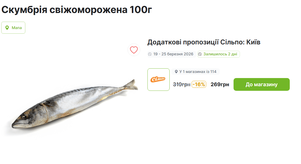 Скумбрія — універсальна риба для швидких і смачних страв: її тушкують, запікають чи маринують. І саме зараз у "Сільпо" її можна купити за вигідною ціною, що робить приготування маринованої риби ще приємнішим. Так, з 19 по 25 березня 2026 року у магазинах "Сільпо" свіжоморожену скумбрію 100г пропонують лише за 269 грн замість звичних 319 грн, тобто економія складає 16% або 50 грн. Це чудова нагода не лише заощадити, а й спробувати приготувати ароматну закуску власноруч. Купуючи скумбрію за акційною ціною, можна експериментувати з маринадами, додавати спеції і створювати нові смачні варіації страви без страху зіпсувати продукт.