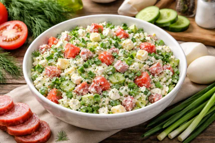 Салати бувають найрізноманітніші — від легких овочевих до ситних багатошарових, серед яких особливе місце займає олів’є та його численні варіації з м’ясом, рибою чи навіть безмайонезними заправками. Але сьогодні пропонується свіжий і ніжний "Весняний" салат із кисломолочним сиром, який поєднує легкість овочів і ситність білкових інгредієнтів. При його приготуванні важливо обирати якісні продукти: свіжий сир без зайвої вологи, хрусткі огірки без гіркоти, стиглі томати та ароматну зелень, адже саме вони формують баланс смаку й текстури. Типова помилка — надлишок майонезу або надто водянисті овочі, тому варто контролювати консистенцію та при бажанні частково замінювати заправку на сметану чи грецький йогурт. Рецептом смакоти з нами поділилися на Instagram-сторінці "vistovska_cooking".