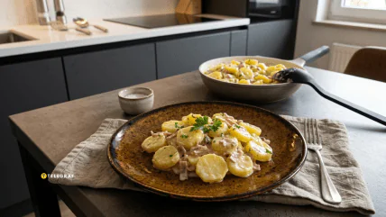 В оригінальному рецепті картопля спеціально відварюється до напівготовності. Але можна спростити процес і використовувати вже відварену картоплю, яка залишилася після приготування салатів або інших страв. Так само підійде і шинка з м’ясної нарізки — це чудовий спосіб не купувати продукти окремо, а використовувати те, що вже є під рукою. Як приготувати картоплю з шинкою у вершковому соусі, показали на сторінці в Instagram schnelle_alltagsgerichte.