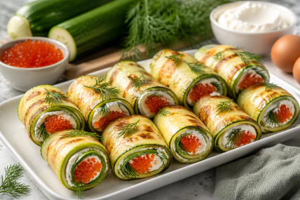 Кабачкові рулети найкраще подавати охолодженими як закуску або легку страву до основного столу. Вони добре поєднуються зі свіжими овочами, зеленими салатами та легкими соусами на основі йогурту або сметани. Для більш святкової подачі рулети можна викласти на тарілку шарами, прикрасити зеленню та краплями ікри зверху. Також вони вдало виглядають у форматі фуршетної закуски, коли подаються невеликими порціями на шпажках.