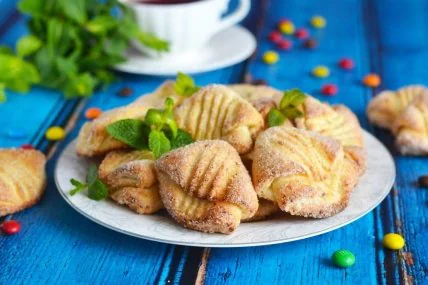- Цукор змішуємо з ванільним цукром, обвалюємо тісто з обох боків. Складаємо кружечки навпіл, потім ще раз навпіл. Перекладаємо на пергамент, ставимо в духовку на 170 градусів і випікаємо до золотистого кольору.