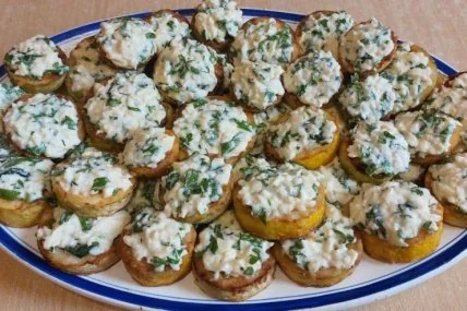 - Готові кружечки кабачків розкладіть на велику страву, зверху викладіть начинку. Залишіть страву на півгодини при кімнатній температурі та подавайте. Смачного!